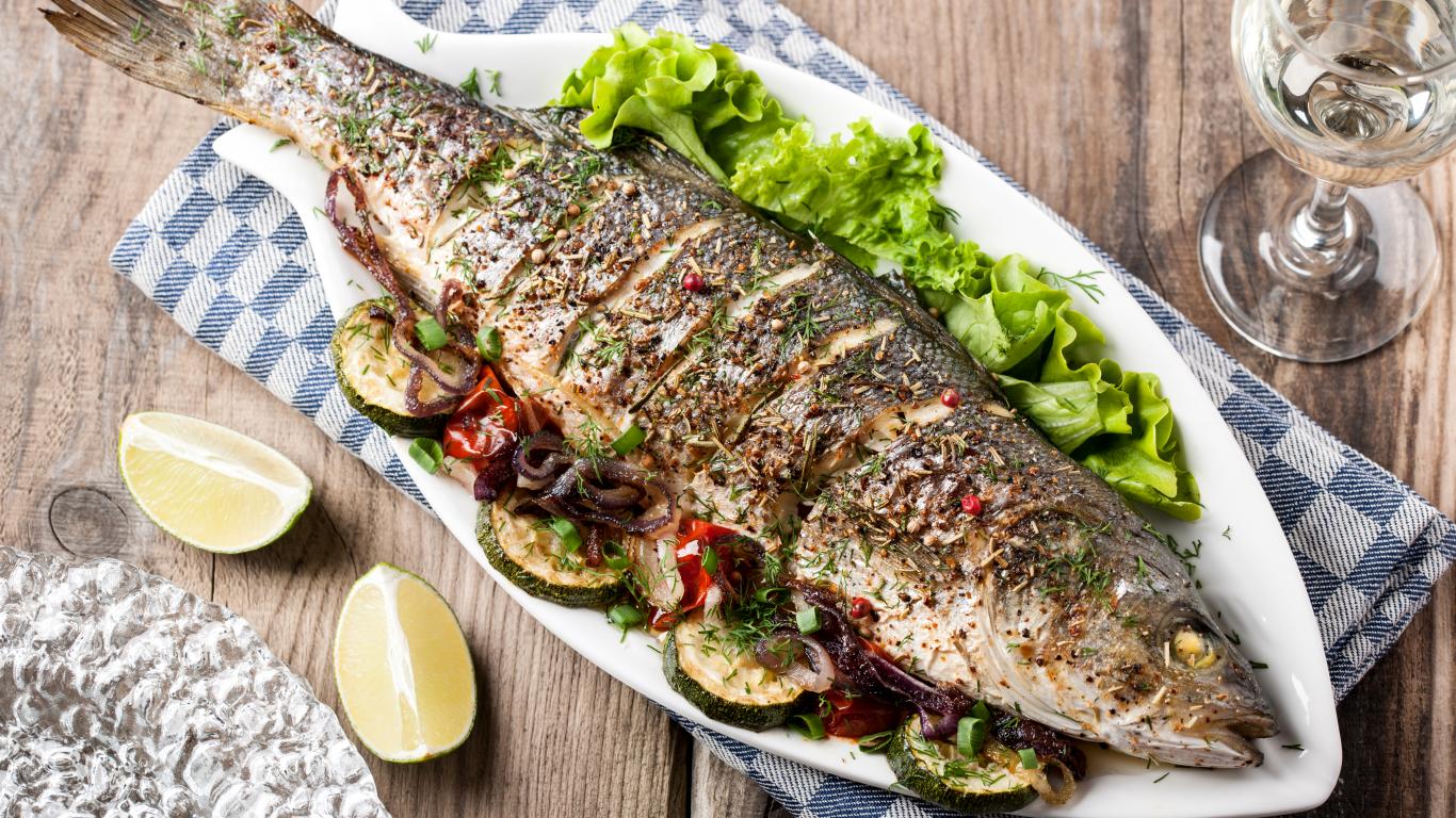 Wallpaper Large baked fish with zucchini and lettuce