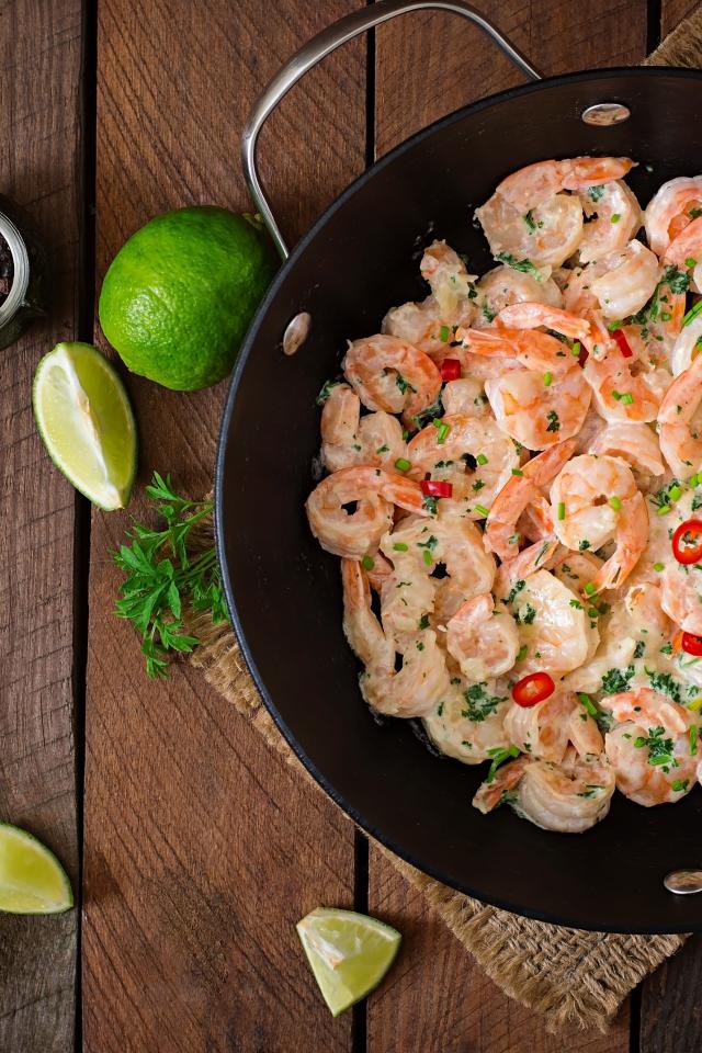Wallpaper Shrimps with sauce in a pan on the table with lime