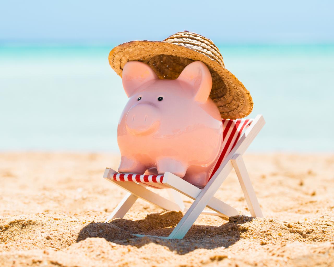Wallpaper Souvenir piggy in hat lies in a toy chair on the beach