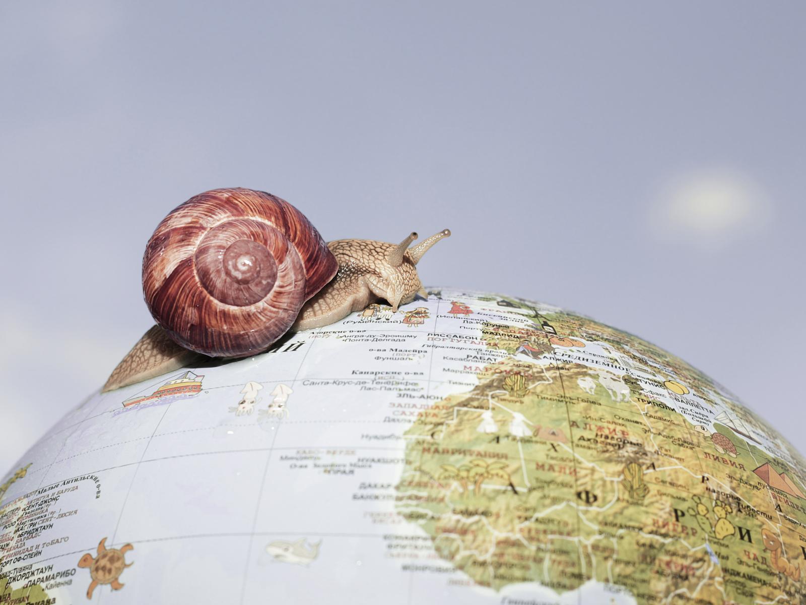 Wallpaper The snail crawls along the globe on a gray background