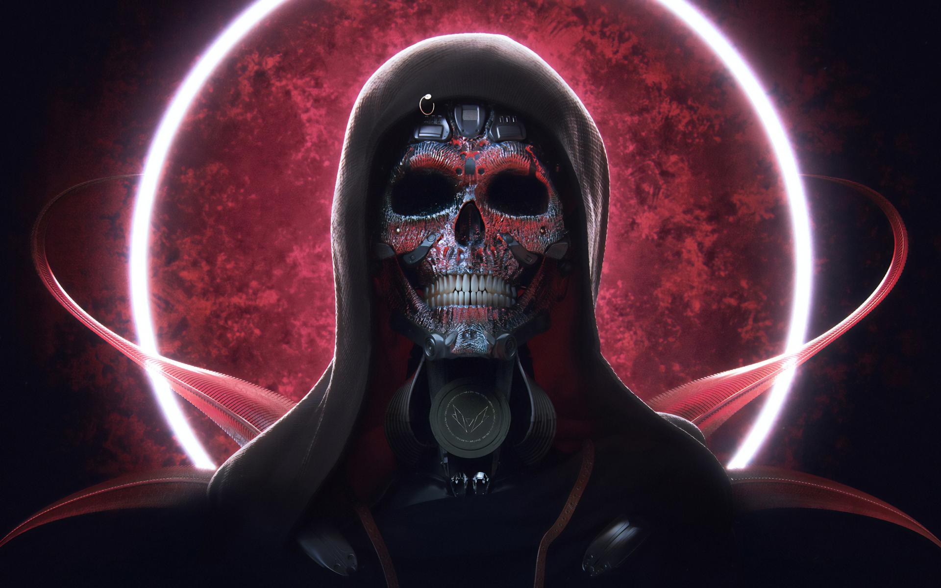 Wallpaper Cyborg in a black hoodie on a background of the red moon