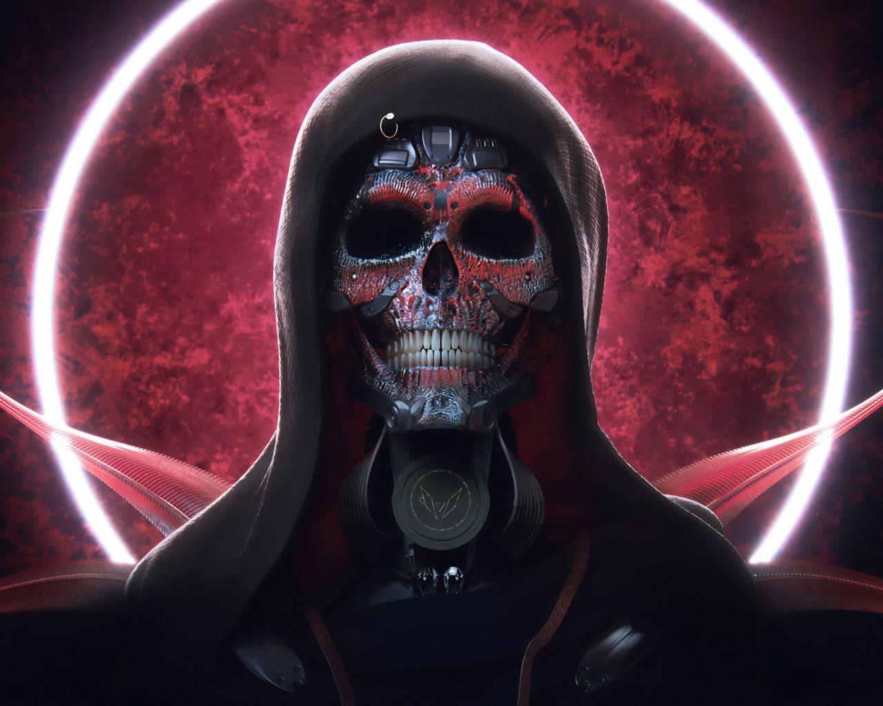 Wallpaper Cyborg in a black hoodie on a background of the red moon