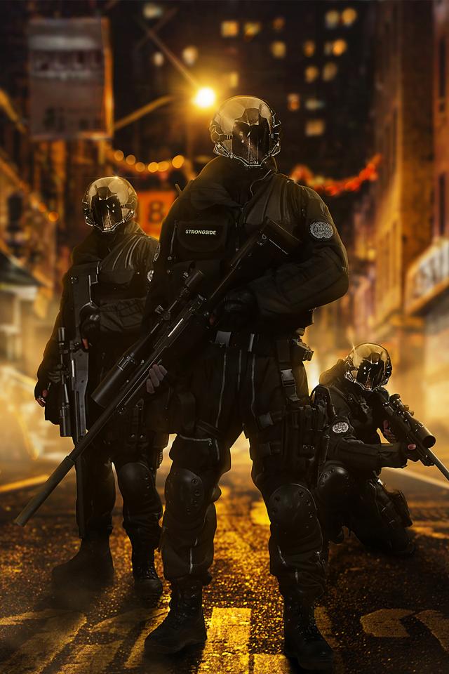 Wallpaper Soldiers with guns on a city street