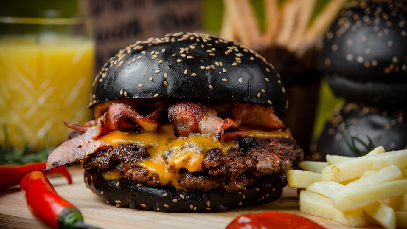 Wallpaper Hamburger with black bun on a table with french fries and red pepper
