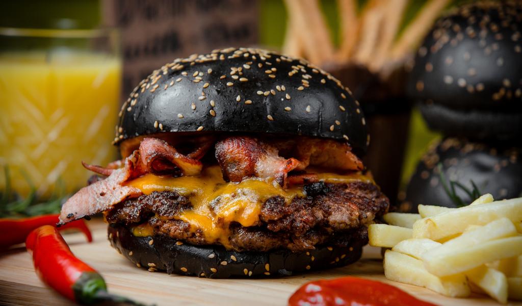Wallpaper Hamburger with black bun on a table with french fries and red pepper