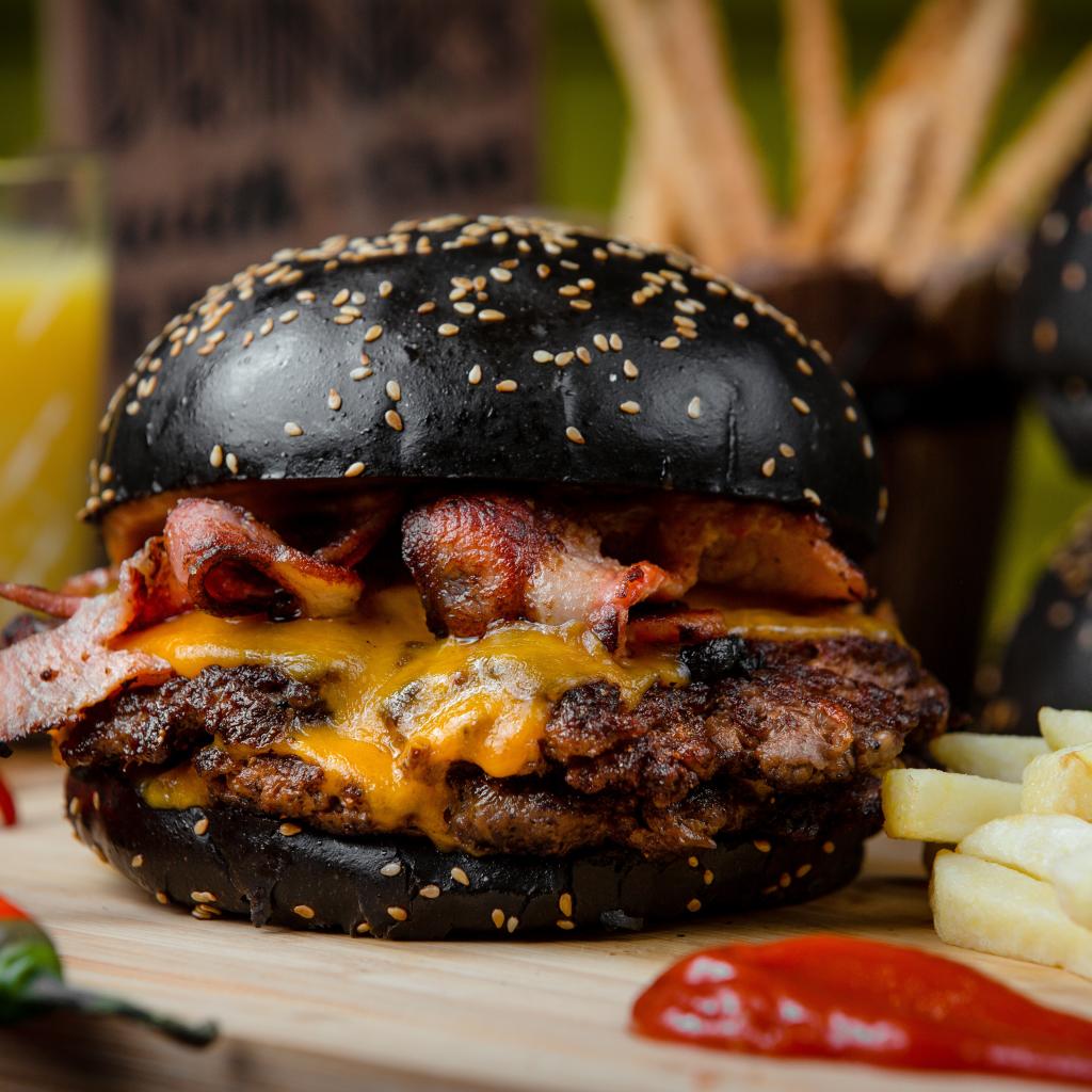 Wallpaper Hamburger with black bun on a table with french fries and red pepper