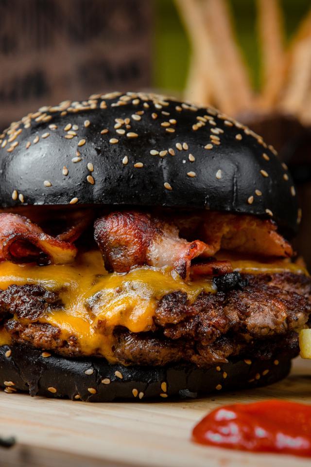 Wallpaper Hamburger with black bun on a table with french fries and red pepper