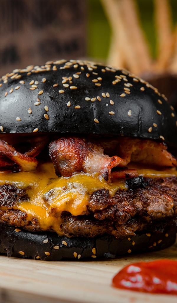Wallpaper Hamburger with black bun on a table with french fries and red pepper