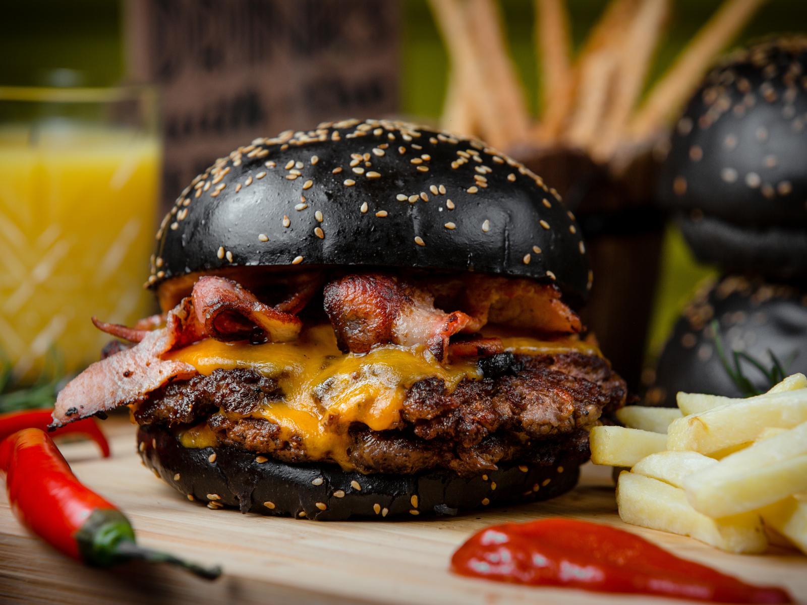 Wallpaper Hamburger with black bun on a table with french fries and red pepper