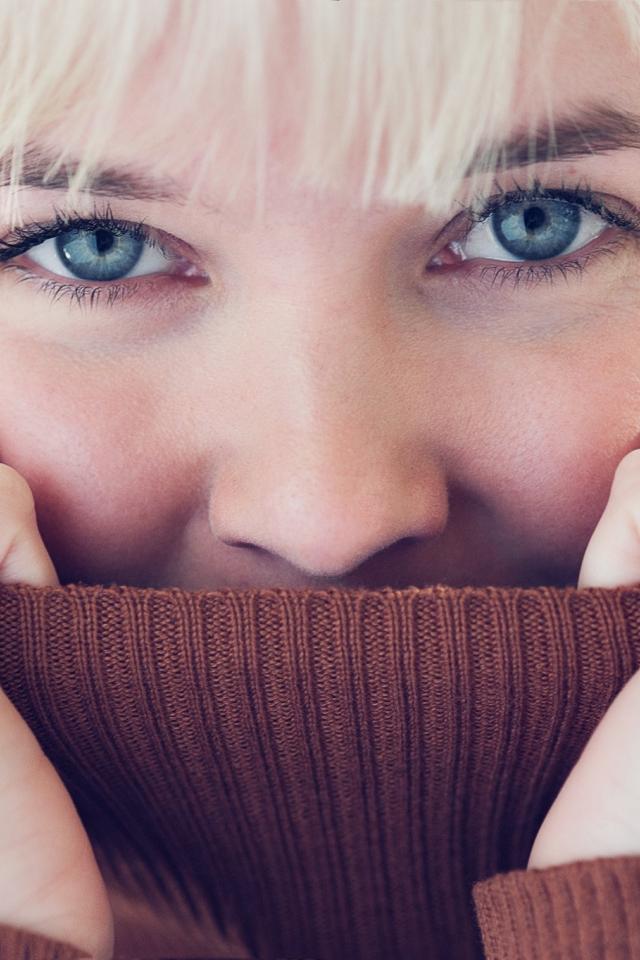 Wallpaper Blonde girl hides her face in the collar sweater