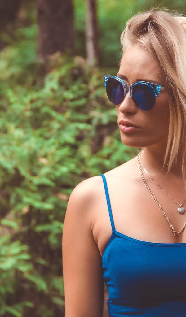 Wallpaper Smiling girl in sunglasses and a hat by the pool