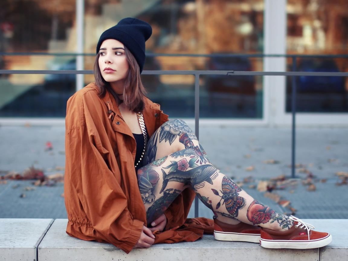 Wallpaper Girl in a hat with a tattoo on his feet