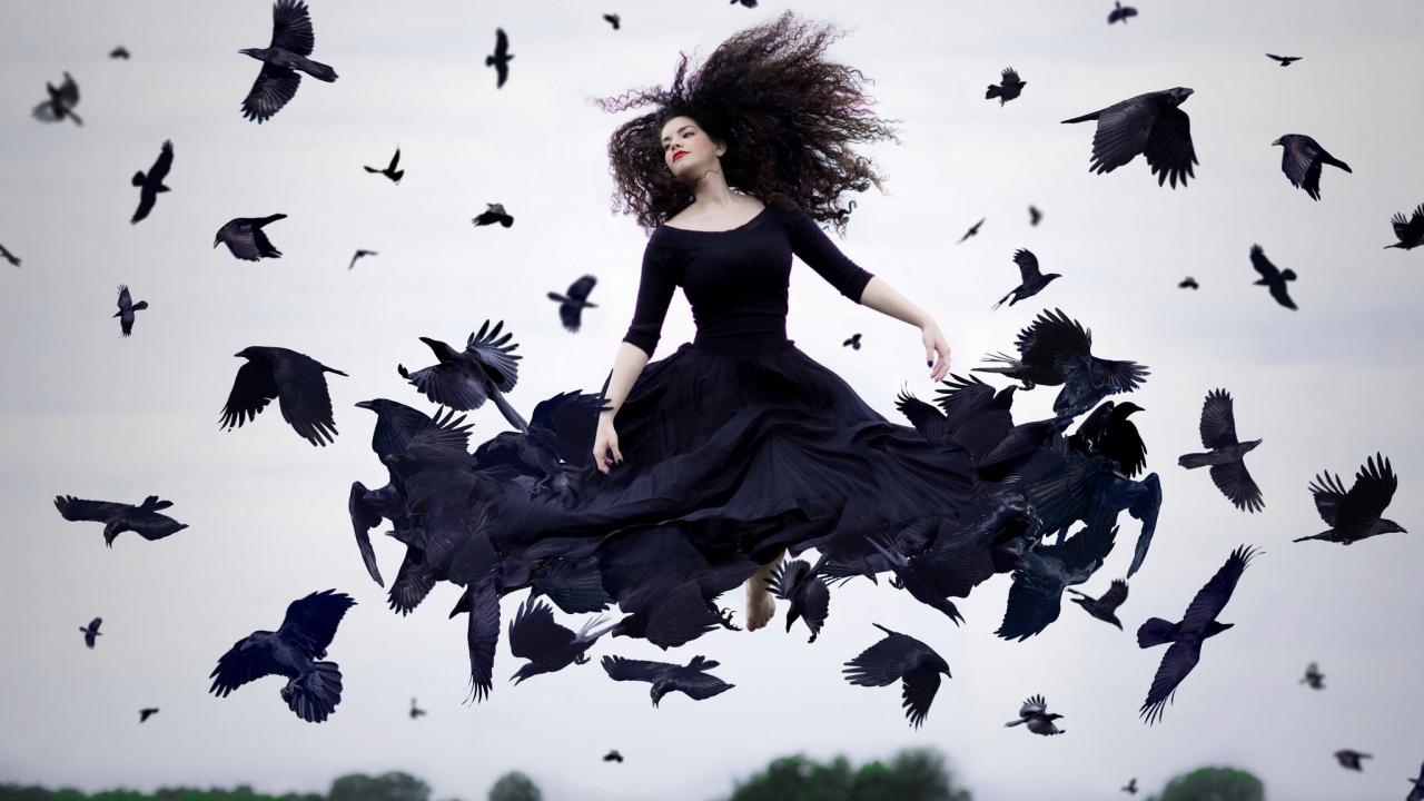 » Wallpaper The girl in a black dress soars among crows