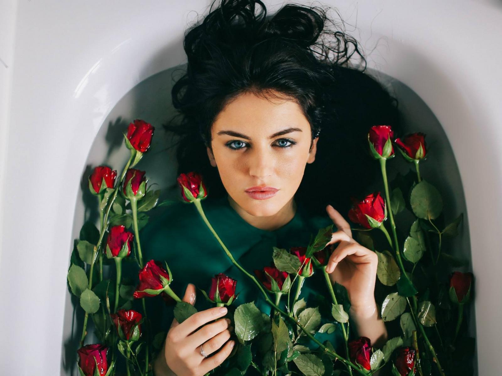 Wallpaper Aurela Skandaj brunette among the roses in the bathroom