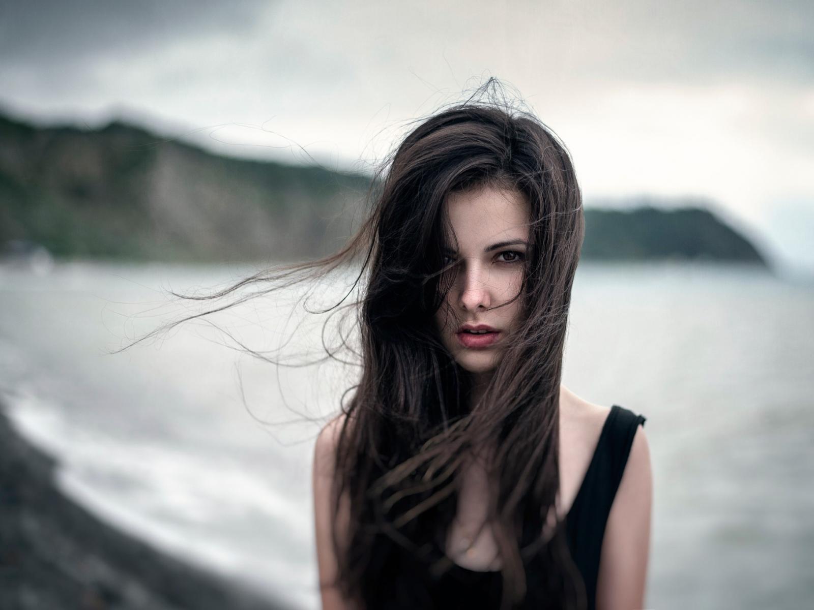 Wallpaper The wind ruffled the girl`s hair by the sea, portrait