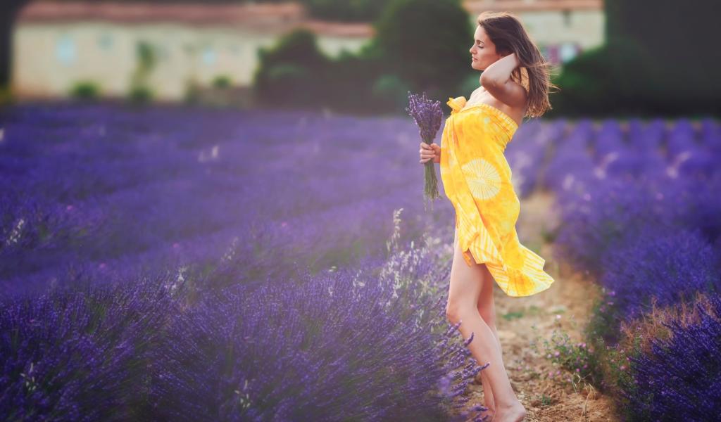 Wallpaper The girl in yellow pareo with a bouquet of lavender on field