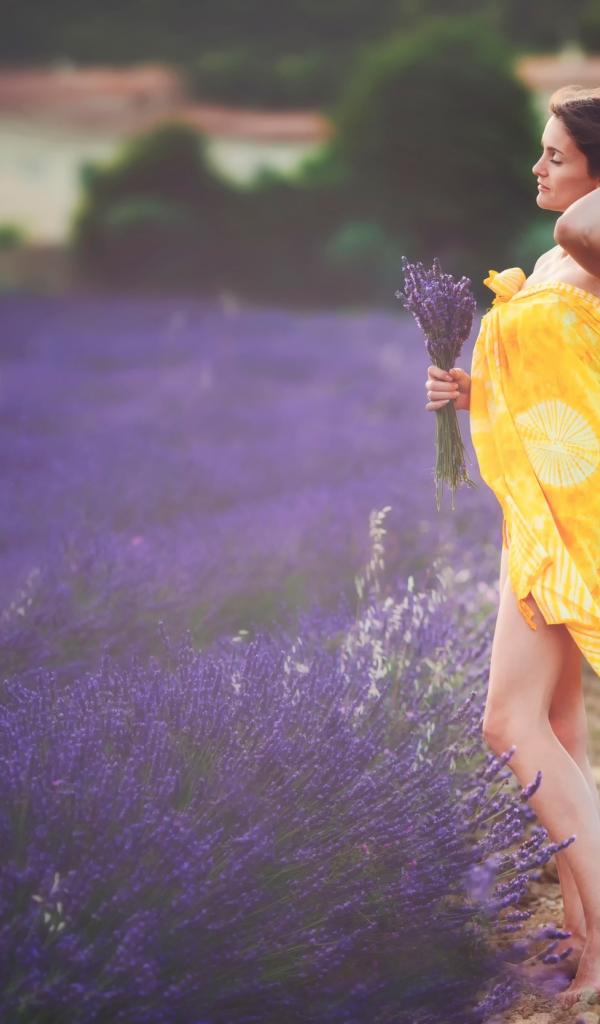 Wallpaper The girl in yellow pareo with a bouquet of lavender on field