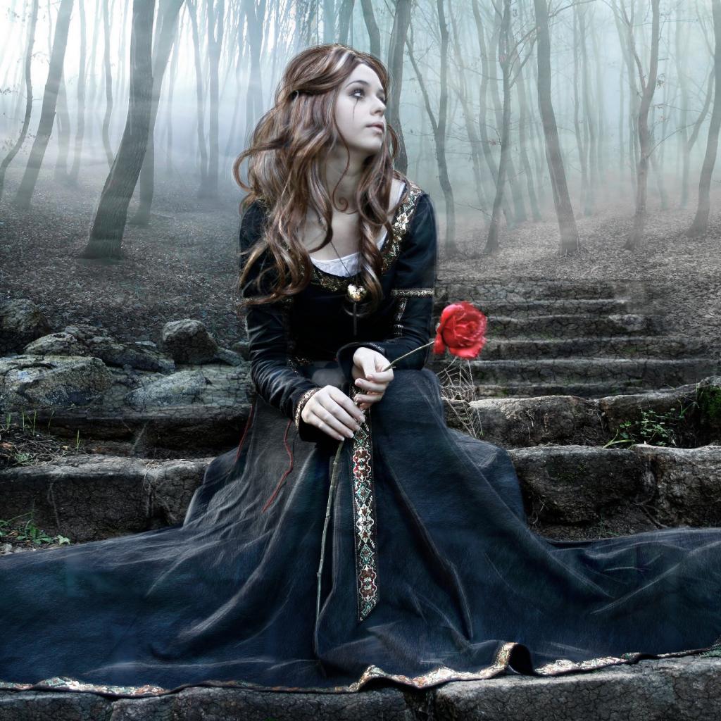 Wallpaper Girl in a black dress and a rose in her hand sitting on stone stairs