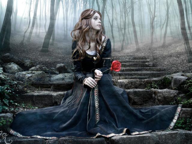 Wallpaper Girl in a black dress and a rose in her hand sitting on stone stairs