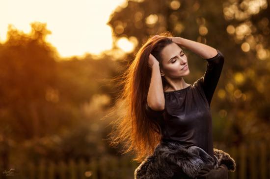 Wallpaper The girl in a black dress corrects hair, portrait