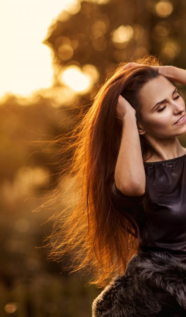 Wallpaper The girl in a black dress corrects hair, portrait