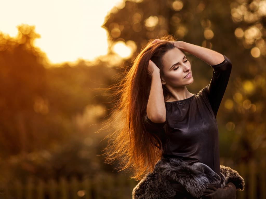 Wallpaper The girl in a black dress corrects hair, portrait