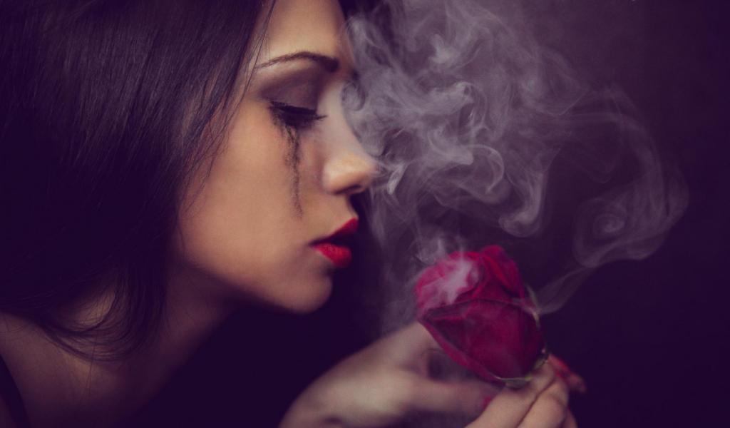 Wallpaper The girl looks at smoking rose