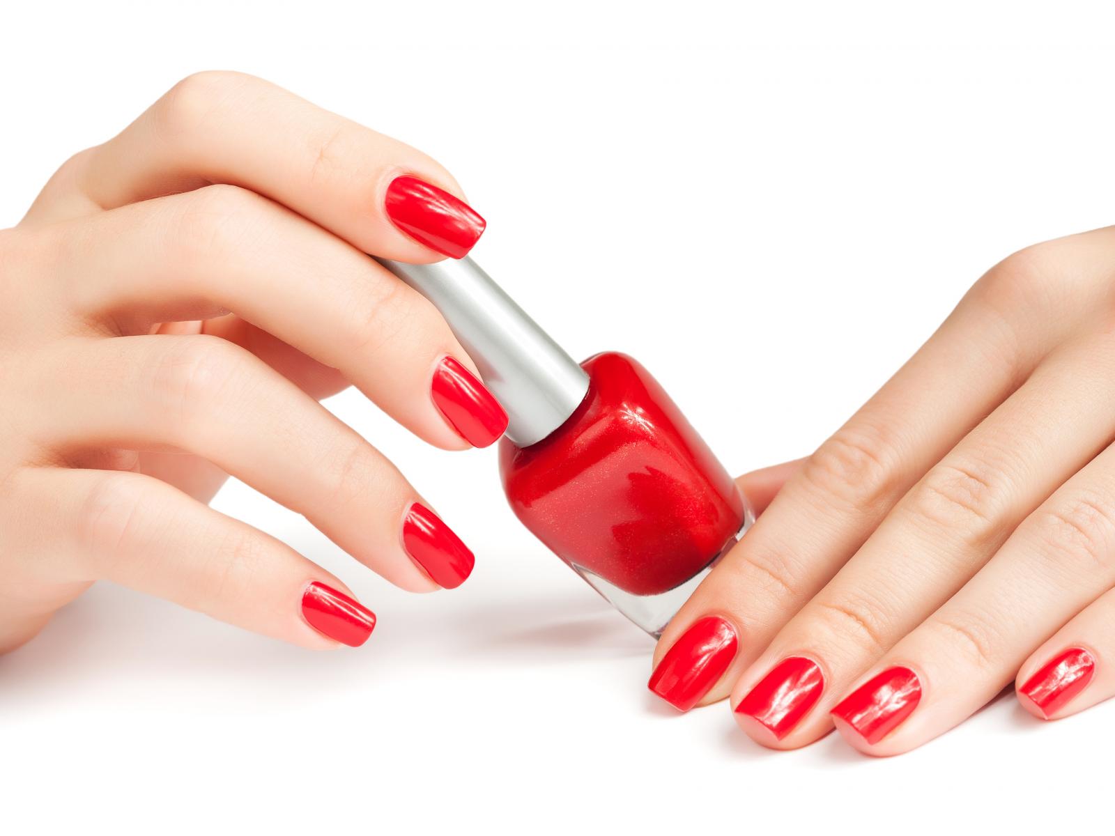 Wallpaper Female hands with a red manicure and varnish on a white background