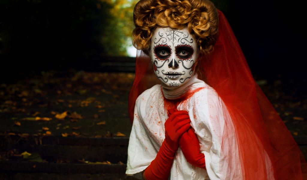 Wallpaper Girl with a facial mask and red veil for Halloween