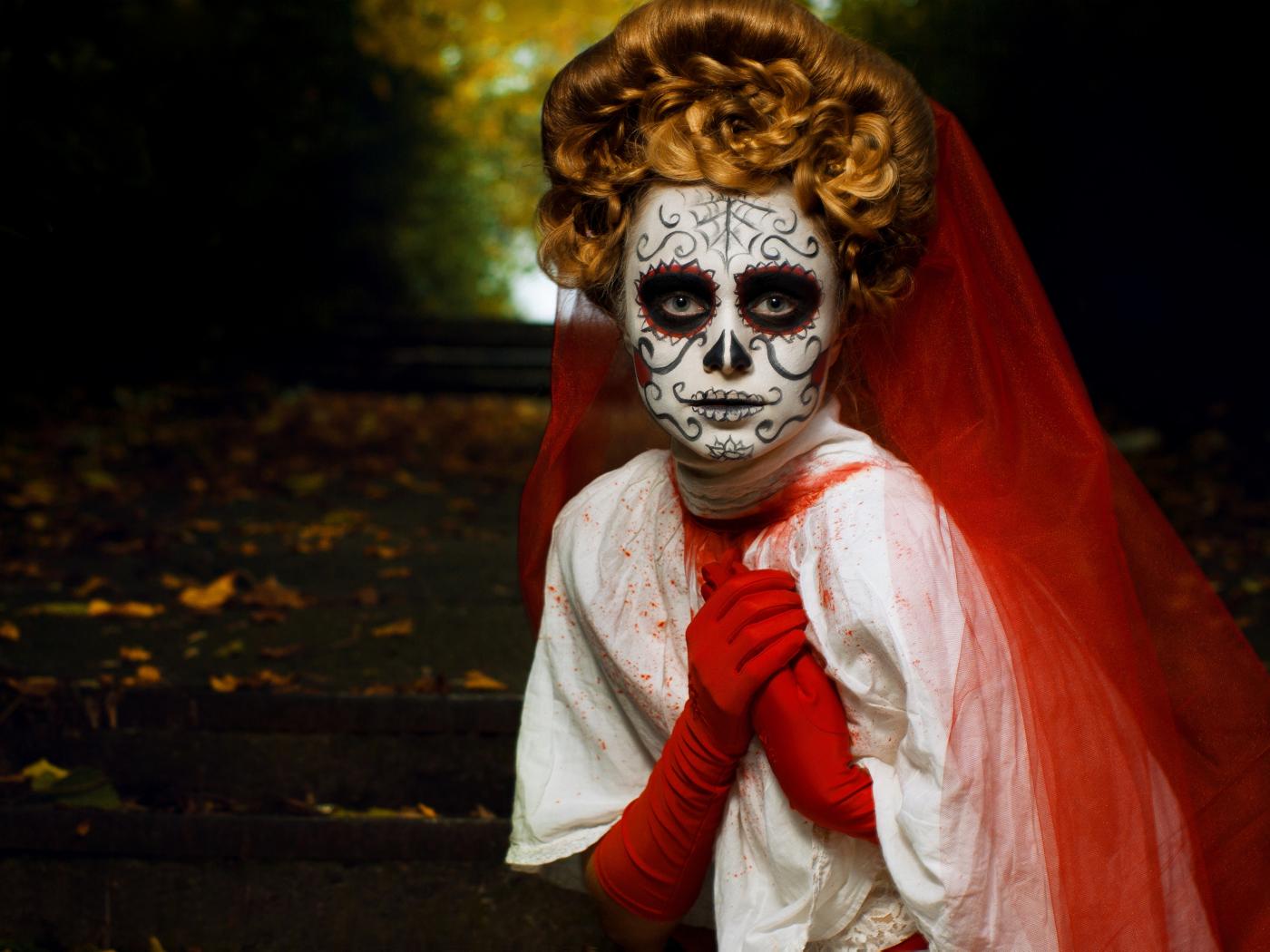 Wallpaper Girl with a facial mask and red veil for Halloween