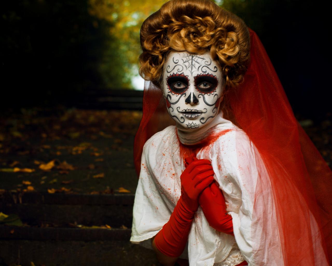 Wallpaper Girl with a facial mask and red veil for Halloween