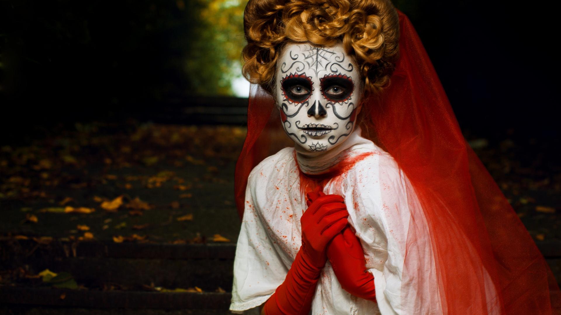 Wallpaper Girl with a facial mask and red veil for Halloween