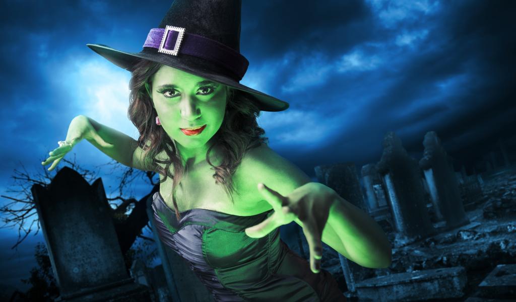 Wallpaper Little girl in a witch costume with a magic book on Halloween