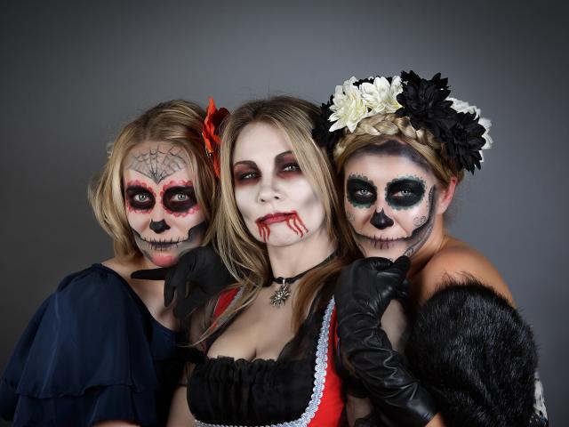 Wallpaper Three girls with masks and Halloween costumes