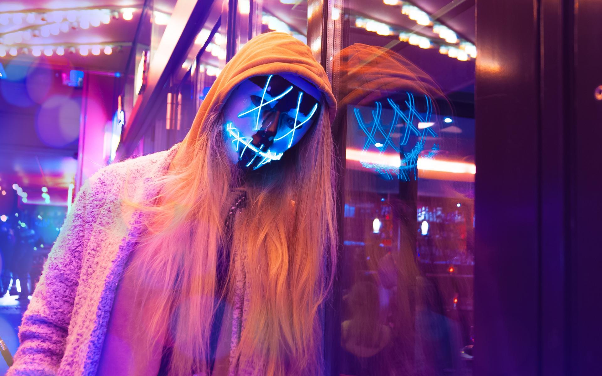Wallpaper Girl in a hoodie and a neon mask against the wall