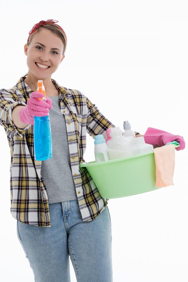 Wallpaper Girl housewife doing the cleaning on a white background