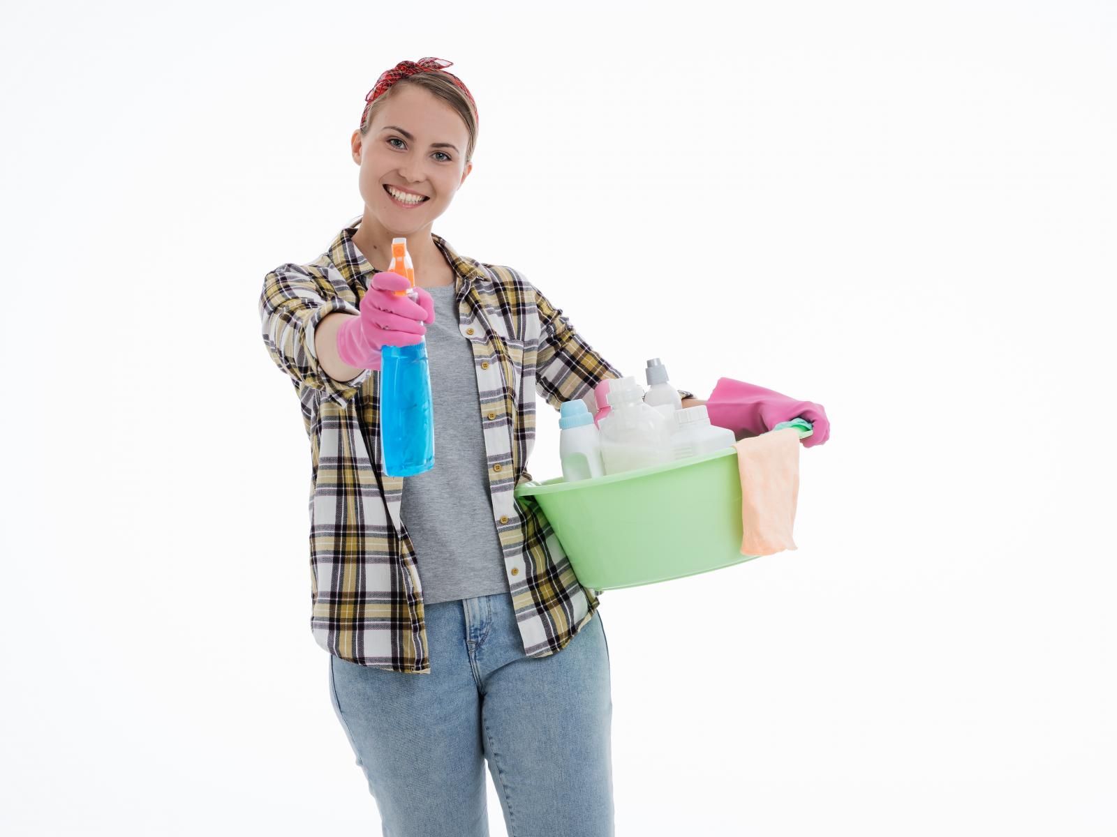 Wallpaper Girl housewife doing the cleaning on a white background