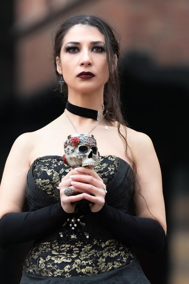 Wallpaper Gothic girl with a glass - a skull in her hands