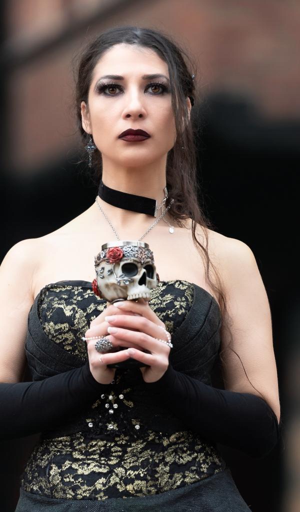 Wallpaper Gothic girl with a glass - a skull in her hands