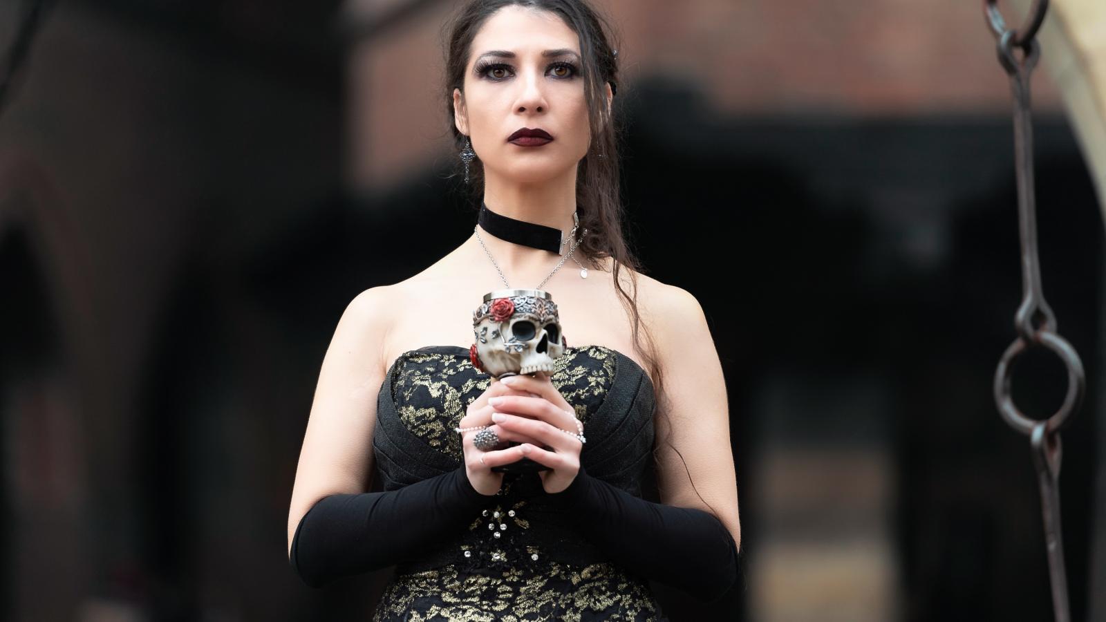 Wallpaper Gothic girl with a glass - a skull in her hands