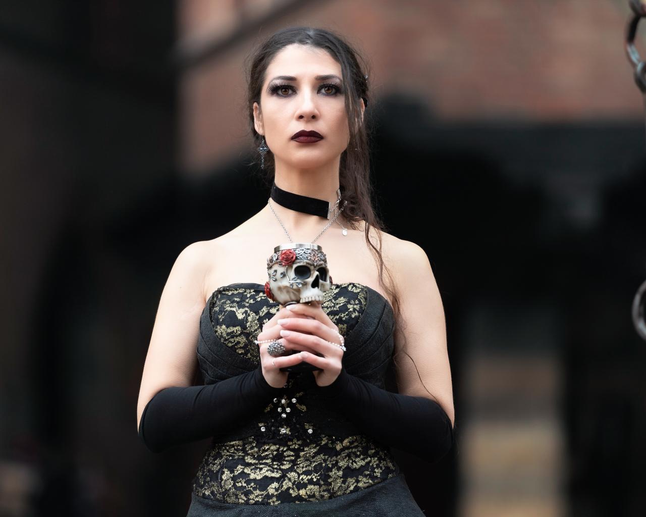 Wallpaper Gothic girl with a glass - a skull in her hands
