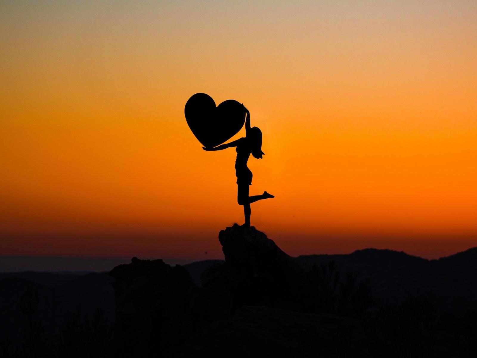 Wallpaper Silhouette girl with a heart in hands on a sunset background