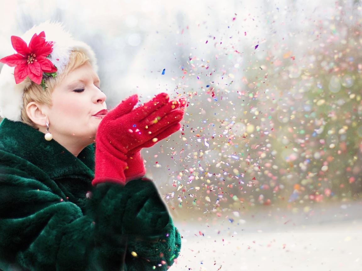 Wallpaper Woman in a fur coat blows off confetti from her palms