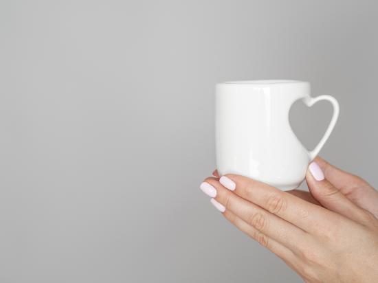 Wallpaper White mug in the hands of a girl on a gray background