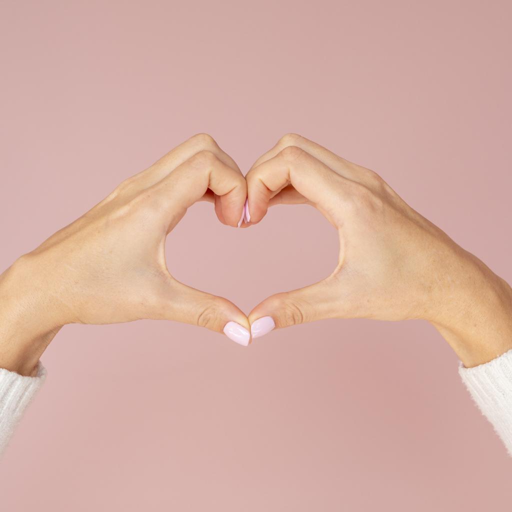 Wallpaper Girl making a heart with her hands on a pink background