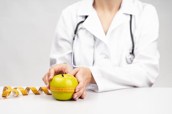 Wallpaper Woman doctor measures an apple with a centimeter