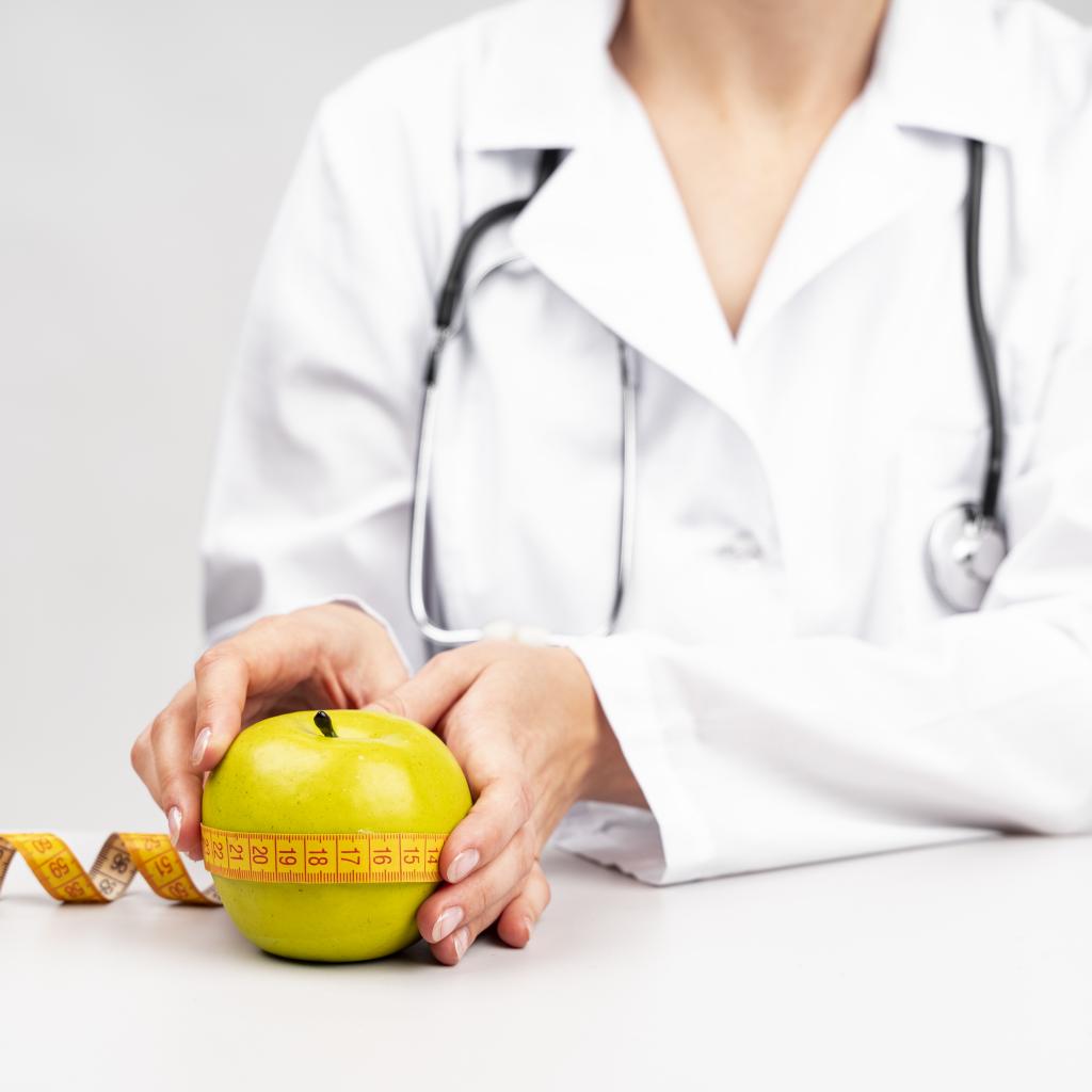 Wallpaper Woman doctor measures an apple with a centimeter