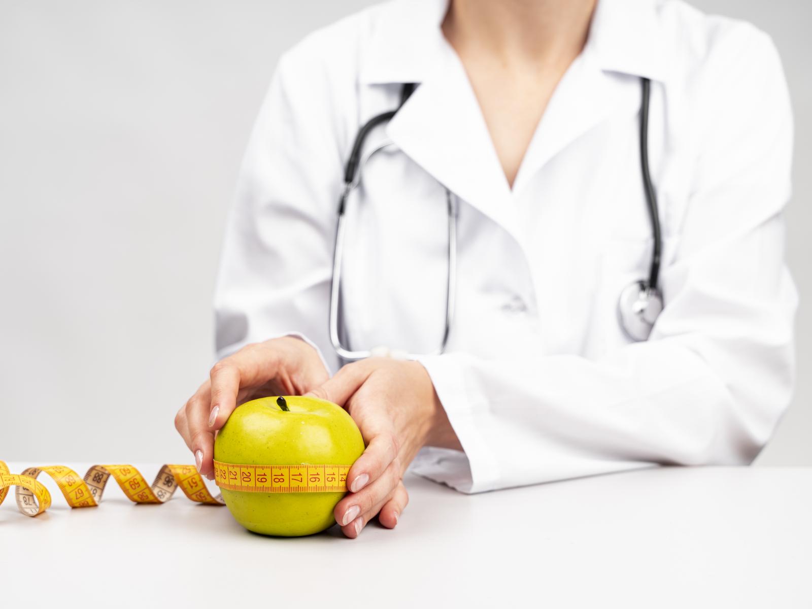 Wallpaper Woman doctor measures an apple with a centimeter