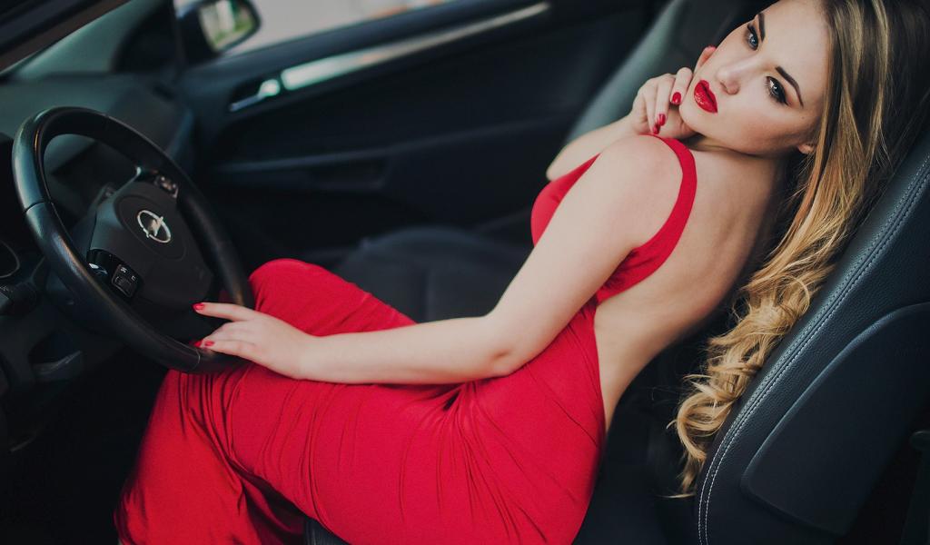 Wallpaper Beautiful girl in red dress at the wheel