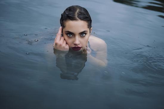 Wallpaper Beautiful brunette girl sitting by the water on the bridge
